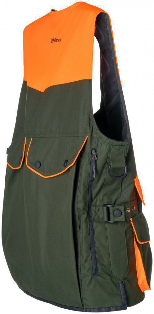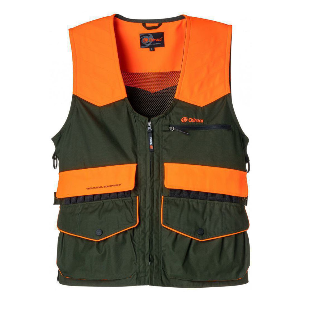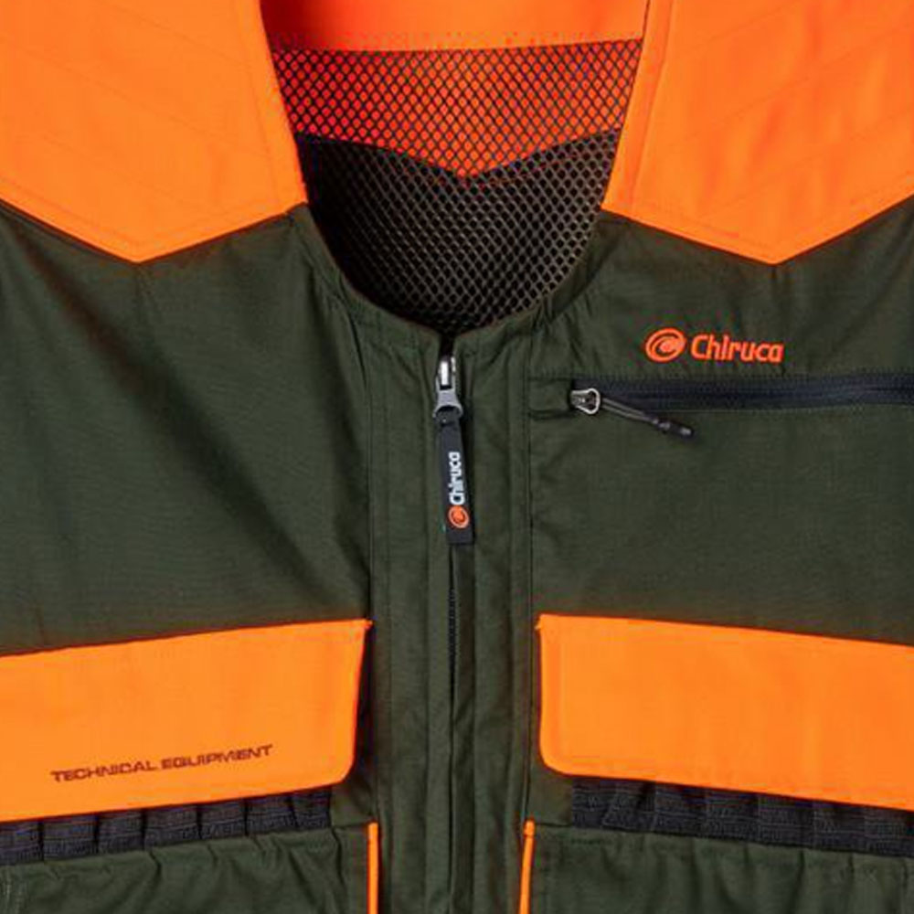 Γιλέκο Κυνηγίου της Ισπανίκης εταιρείας Chiruca μοντέλο Chaleco Osiris Hi Vis 08 σε χακί χρωματισμό με πορτοκαλί λεπτομέρειες όπως επιβάλουν πλέον τα μέτρα προστασίας για να είστε ευδιάκριτοι όταν κινείστε σε δασικές εκτάσεις. Κατασκευασμένο από 65% Πολυεστέρα και 35% Βαμβάκι με 100% εσωτερική επένδυση από πλέγμα πολυεστέρα όπου σε συνδυασμό με την προσαρμοσμένη ελαφριά και διαπνέουσα επένδυση της CHIRUCA σας προσφέρει μεγάλη αναπνευσιμότητα και προστασία από την υγρασία και την βροχή. Επίσης είναι εξοπλισμένο με ελαφριά προστατευτική επένδυση και στους δύο ώμους. Διαθέτει πληθώρα από τσέπες και θήκες για μεγαλύτερη εργονομία και ευκολία στην μεταφορά των προσωπικών σας αντικειμένων. Αναλυτικότερα διαθέτει οχτώ θήκες σε κάθε πλευρά κατάλληλες για φυσίγγια, κάτω τσέπες μεγάλης χωρητικότητας με ελαστικό προσχηματισμό στο άνοιγμα και στο κλείσιμο με κουμπί καθώς επίσης και μπροστινή τσέπη που ασφαλίζει με φερμουάρ.