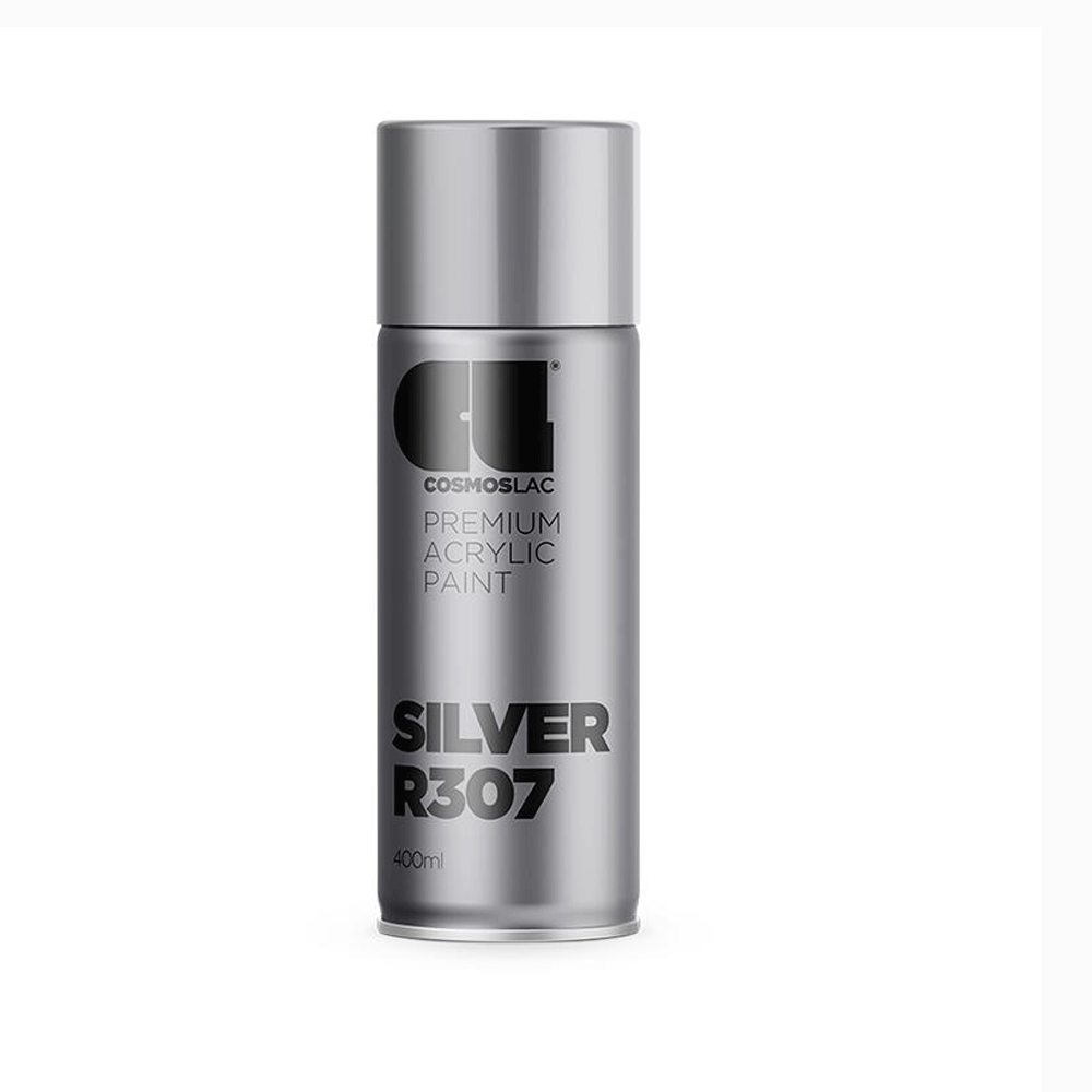 Ακρυλικό σπρέι βαφής CosmosLac R307 Bright Silver 400ml με μεταλλικό εφέ ασημί, υψηλή γυαλάδα και εξαιρετική καλυπτικότητα, ιδανικό για διακοσμητικές εφαρμογές και προστασία επιφανειών.