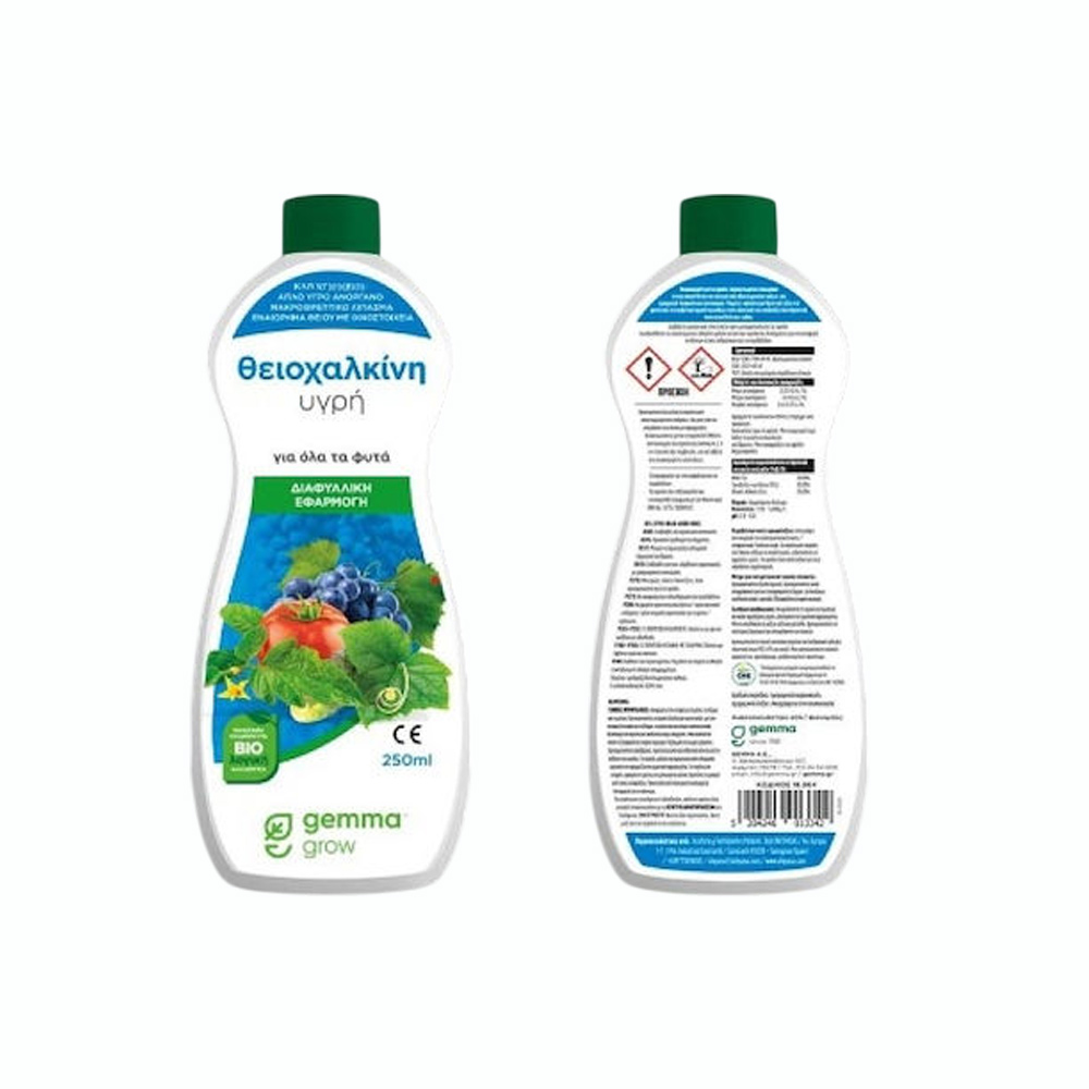Η υγρή θειοχαλκίνη της Gemma είναι ένα απλό υγρό ανόργανο μακροθρεπτικό λίπασμα κατάλληλο για βιολογική γεωργία. Πρόκειται για συμπυκνωμένο εναιώρημα στοιχειακού θείου και χαλκού από οξυχλωριούχο χαλκό, για εφαρμογή διαφυλλικού ψεκασμού. Παρέχει υψηλότερη θρεπτική αξία στα φυτά από τα συμβατικά προϊόντα, καθώς στη σύστασή του συνδυάζει δύο θρεπτικά συστατικά: θείο και χαλκό.