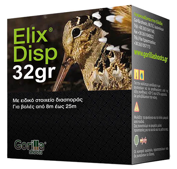 Τα Elix Disp 32gr είναι τα φυσίγγια με το μεγαλύτερο άνοιγμα βολής από οποιοδήποτε άλλο συμβατικό φυσίγγι διασποράς. Το ειδικό στοιχείο διασποράς των Elix Disp 32gr σας προσφέρει 45% μεγαλύτερο άνοιγμα βολής και εκπληκτική κατανομή χωρίς κενά και «τρύπες» από οποιοδήποτε άλλο φυσίγγι διασποράς. Ξεχωρίζει ιδιαίτερα στις χαμηλές θερμοκρασίες και την υγρασία λόγω της ειδικής γόμωσης του.