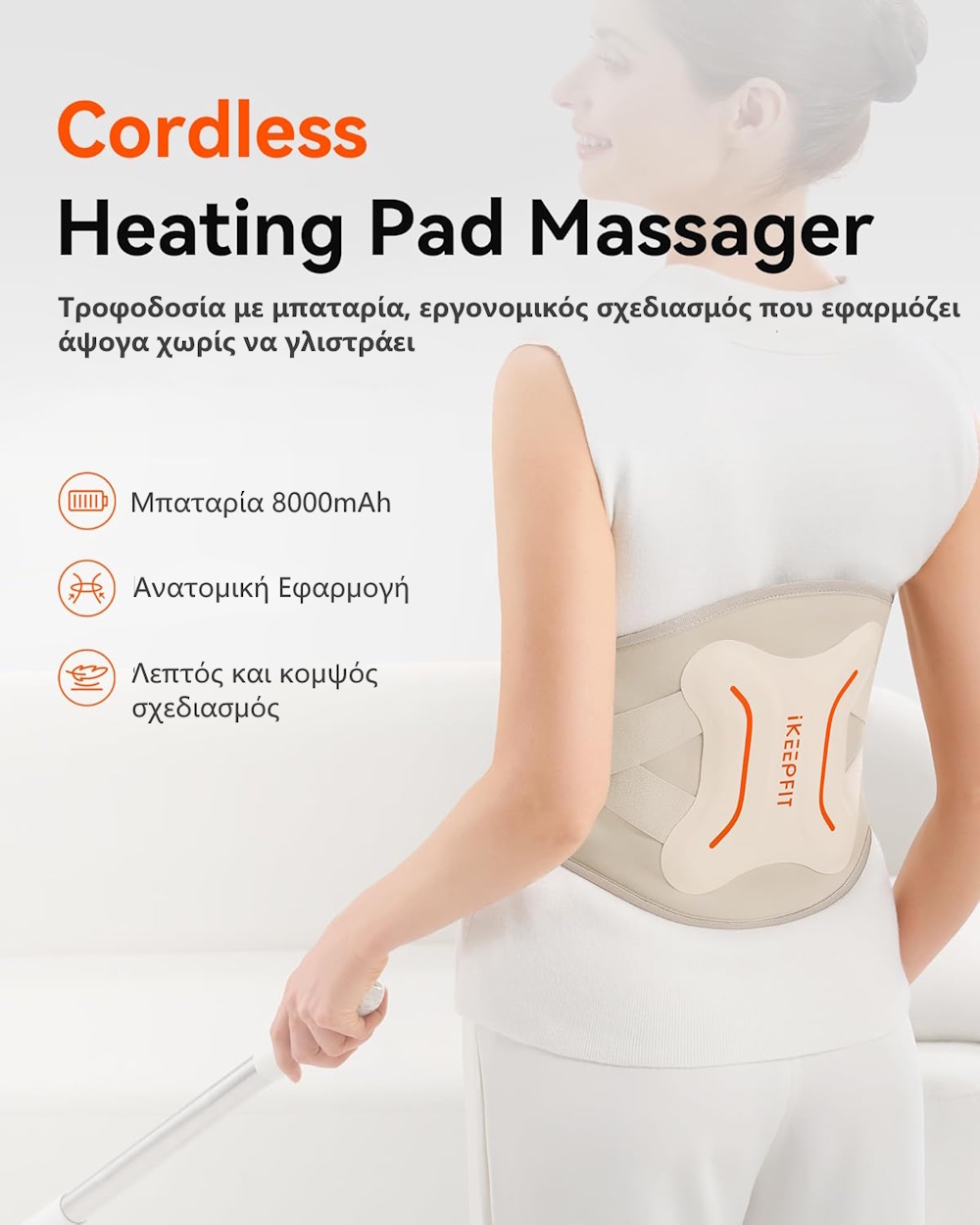 Η θερμαινόμενη ζώνη μέσης με μασάζ και δόνηση iKeepFit Maxwarm 4.0 είναι σχεδιασμένη για όσους αναζητούν άμεση ανακούφιση από πόνους στη μέση, την οσφυϊκή μοίρα και τον κορμό, συνδυάζοντας θερμότητα, δονήσεις, υποστήριξη μέσης και ασύρματη λειτουργία. Με την ενσωματωμένη μπαταρία των 8000mAh, λειτουργεί χωρίς καλώδια, προσφέροντας ελευθερία κινήσεων και δυνατότητα χρήσης οπουδήποτε: στο σπίτι, στη δουλειά ή στο αυτοκίνητο.