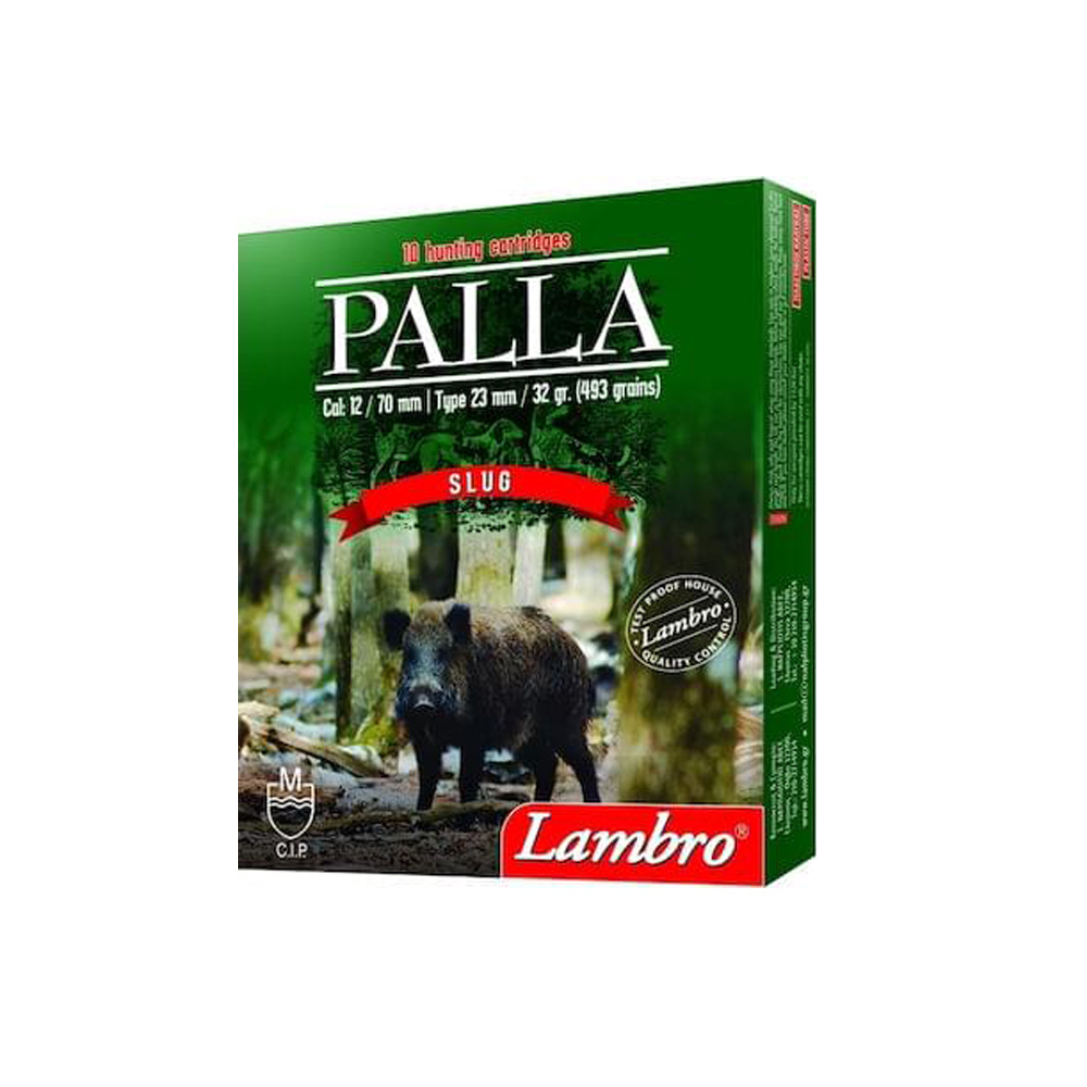 Φυσίγγι Lambro για το κυνήγι του αγριόχοιρου, μονόβολο 32 γραμμαρίων. Μεγάλη ακρίβεια, ταχύτητα & δύναμη κρούσης. Συγκέντρωση 10 βολών σε 3,5cm, στα 20m. Το PALLA® είναι ένα κλασικό μονόβολο 32 γραμμαρίων για το κυνήγι του αγριόχοιρου, με μεγάλη ταχύτητα και δύναμη κρούσης. Η ακρίβειά του είναι μοναδική αφού στα 20 μέτρα συγκεντρώνει 10 βολές σε μόλις 3,5 εκατοστά! Μπορεί να χρησιμοποιηθεί με όλα τα τσοκαρίσματα (ακόμα και με full choke).