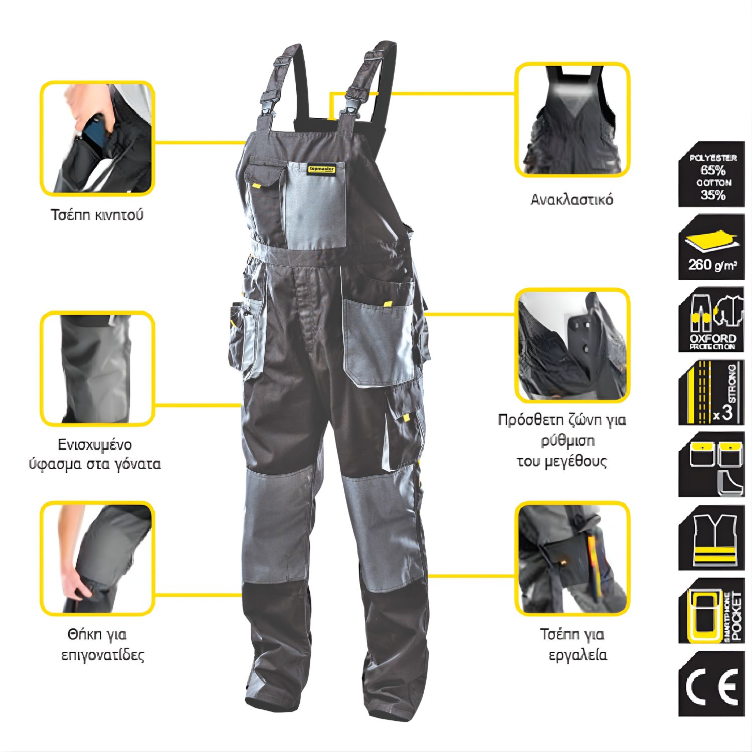 Η τιράντα φόρμα Top Master σε μέγεθος L είναι κατασκευασμένη από υψηλής ποιότητας υλικό, με το 65% πολυεστέρα και το 35% βαμβάκι για ανθεκτικότητα και άνεση. Η μαύρη απόχρωση προσδίδει επαγγελματική εμφάνιση, ενώ η ειδική σχεδίαση με τιράντες εξασφαλίζει ελευθερία κινήσεων.